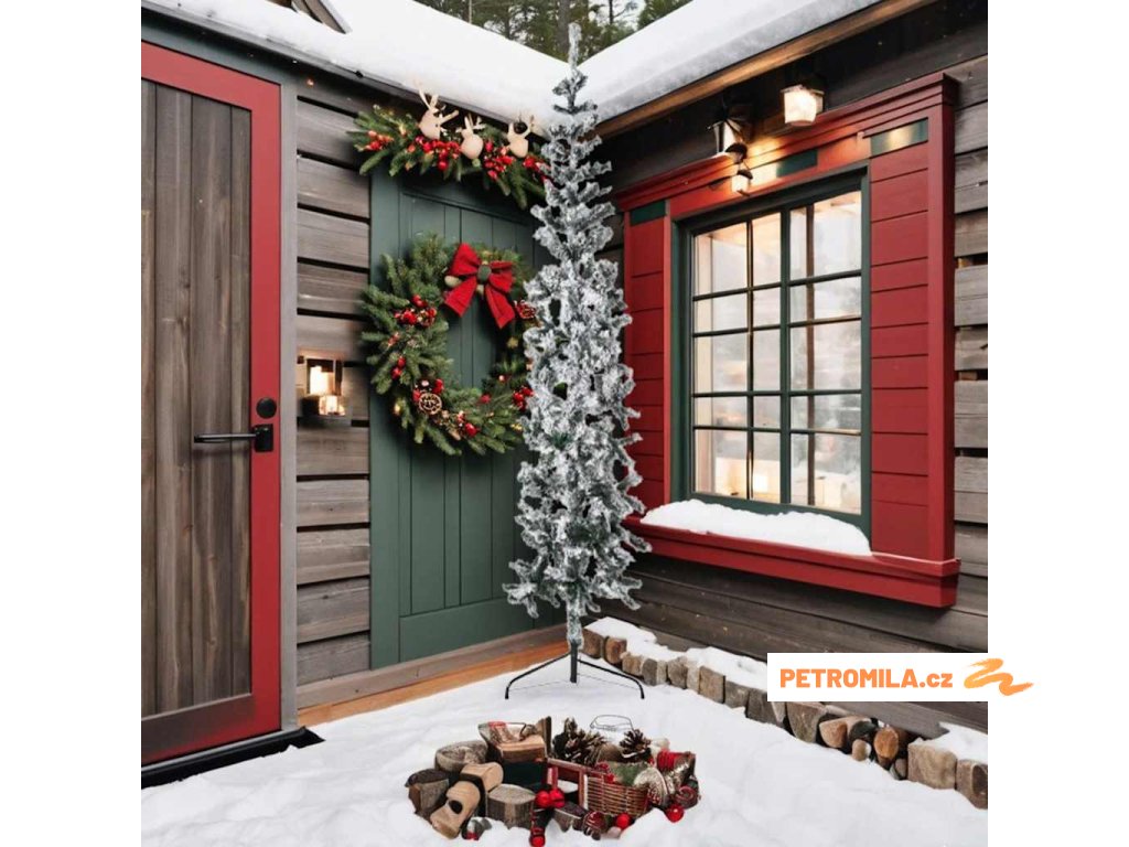 - Design se sněhovým popraškem: Jehličí pokryté bílým sněhovým popraškem dodává úzkému vánočnímu stromku na eleganci.