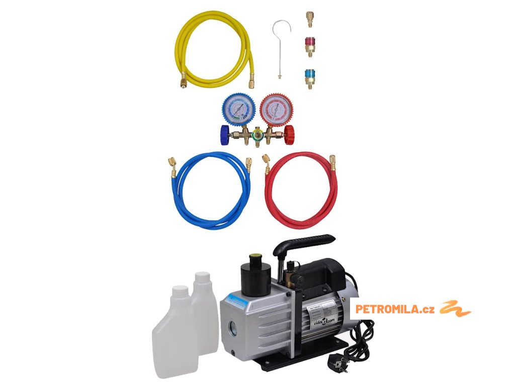 Čerpadlo vytváří podtlak, který umožňuje následné plnění klimatizačního systému chladivem. Čerpadlo má hliníkové pouzdro a praktické okénko pro okamžitou kontrolu hladiny oleje. Má také integrované madlo pro snadné přenášení. Přiložená 2cestná sada na měření je vhodná pro plnění a kontrolu klimatizačních systémů tím, že poskytuje údaje o tlaku v systému. Je vhodné pro použití na všech klimatizacích automobilů, stejně jako komerčních a domácích klimatizačních chladicích systémech. Barevně označená měřidla jsou jasná a snadno čitelná a jsou uzavřena v ochranném plášti, aby se zabránilo poškození. K rychlému a snadnému zavěšení měřidel můžete použít integrovaný ocelový hák. Sada měřidel má odolnou konstrukci.