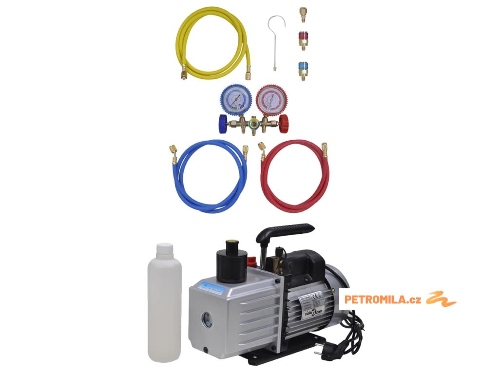 Čerpadlo vytváří podtlak, který umožňuje následné plnění klimatizačního systému chladivem. Čerpadlo má hliníkové pouzdro a praktické okénko pro okamžitou kontrolu hladiny oleje. Má také integrované madlo pro snadné přenášení. Přiložená 2cestná sada na měření je vhodná pro plnění a kontrolu klimatizačních systémů tím, že poskytuje údaje o tlaku v systému. Je vhodné pro použití na všech klimatizacích automobilů, stejně jako komerčních a domácích klimatizačních chladicích systémech. Barevně označená měřidla jsou jasná a snadno čitelná a jsou uzavřena v ochranném plášti, aby se zabránilo poškození. K rychlému a snadnému zavěšení měřidel můžete použít integrovaný ocelový hák. Sada měřidel má odolnou konstrukci.
