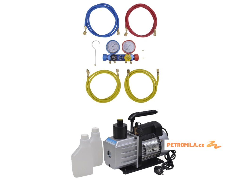 Čerpadlo vytváří podtlak, který umožňuje následné plnění klimatizačního systému chladivem. Čerpadlo má hliníkové pouzdro a praktické okénko pro okamžitou kontrolu hladiny oleje. Má také integrované madlo pro snadné přenášení. Přiložená 4cestná sada na měření je vhodná pro plnění a kontrolu klimatizačních systémů tím, že poskytuje údaje o tlaku v systému. Je vhodné pro použití na všech klimatizacích automobilů, stejně jako komerčních a domácích klimatizačních chladicích systémech. Barevně označená měřidla jsou jasná a snadno čitelná a jsou uzavřena v ochranném plášti, aby se zabránilo poškození. K rychlému a snadnému zavěšení měřidel můžete použít integrovaný ocelový hák. Sada měřidel má odolnou konstrukci.