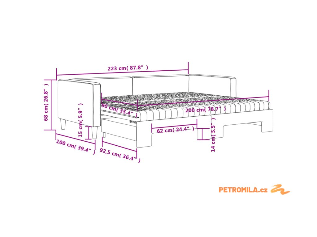 - Rozměry (nevysunuté): 223 x 100 x 68 cm (D x Š x V)