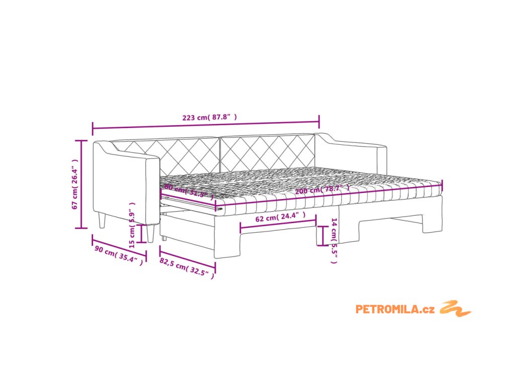 - Rozměry (nevysunuté): 223 x 90 x 67 cm (D x Š x V)