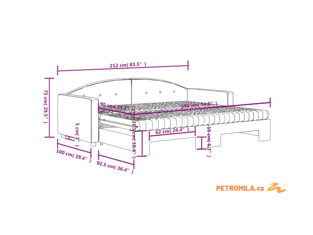 - Rozměry (nevysunuté): 212 x 100 x 75 cm (D x Š x V)