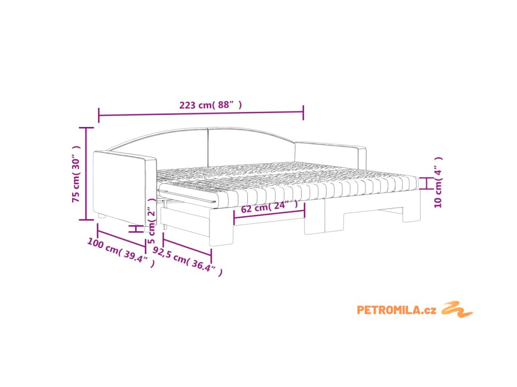 - Rozměry (nevysunuté): 223 x 100 x 75 cm (Š x H x V)
