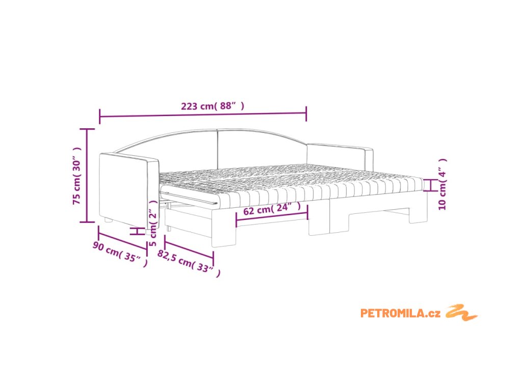 - Rozměry (nevysunuté): 223 x 90 x 75 cm (Š x H x V)