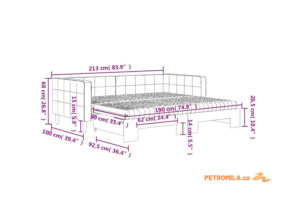 - Rozměry (nevysunuté): 213 x 100 x 68 cm (D x Š x V)