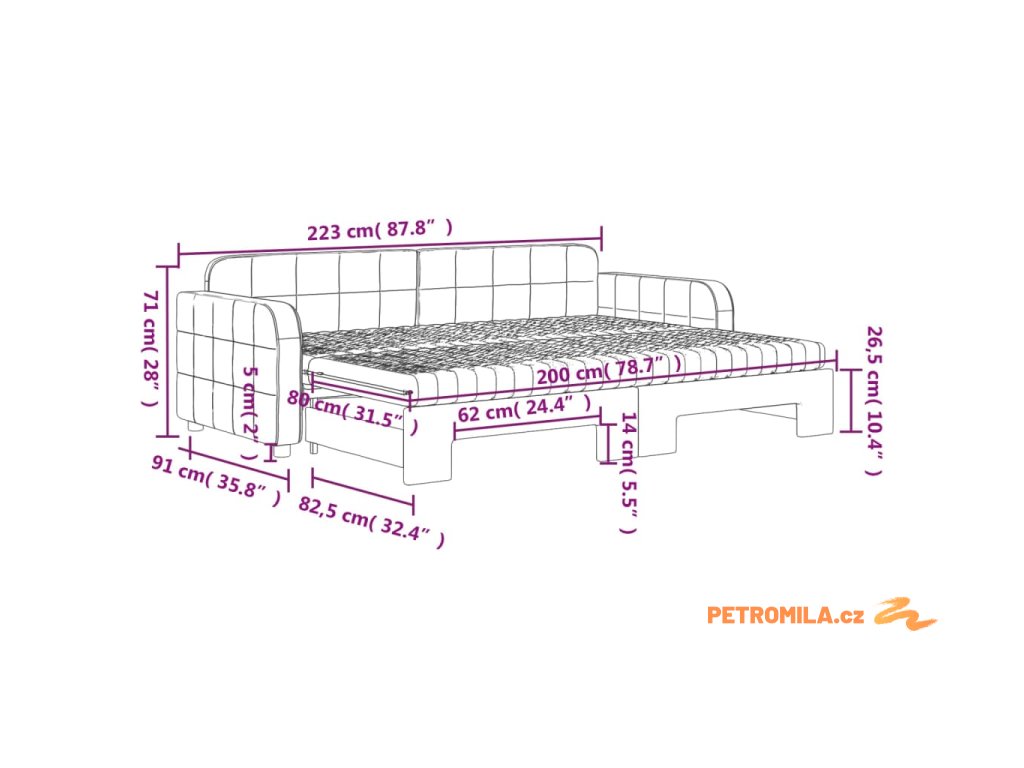 - Rozměry (nevysunuté): 223 x 91 x 71 cm (D x Š x V)