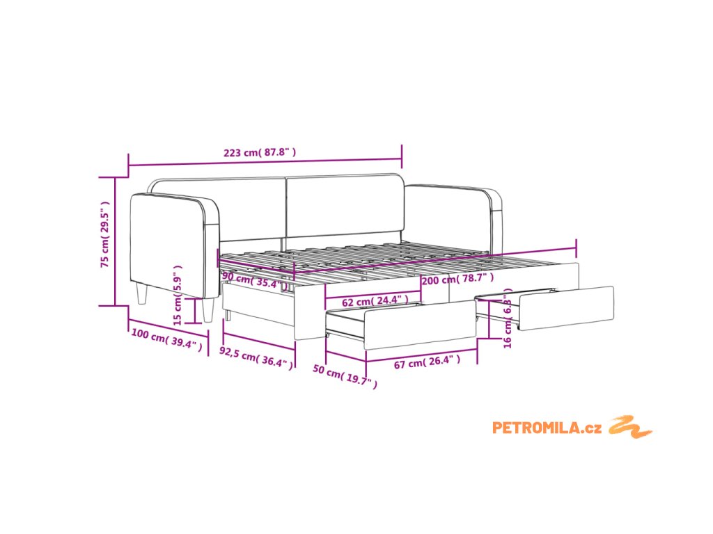 - Rozměry (nevysunuté): 223 x 100 x 75 cm (D x Š x V)
