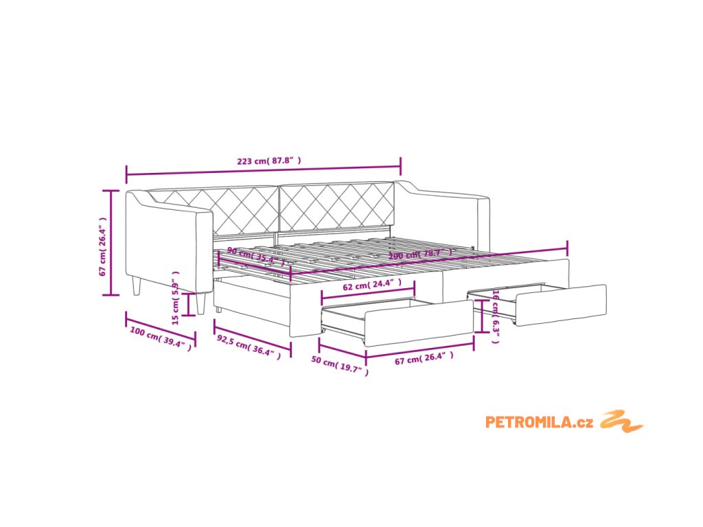 - Rozměry (nevysunuté): 223 x 100 x 67 cm (D x Š x V)