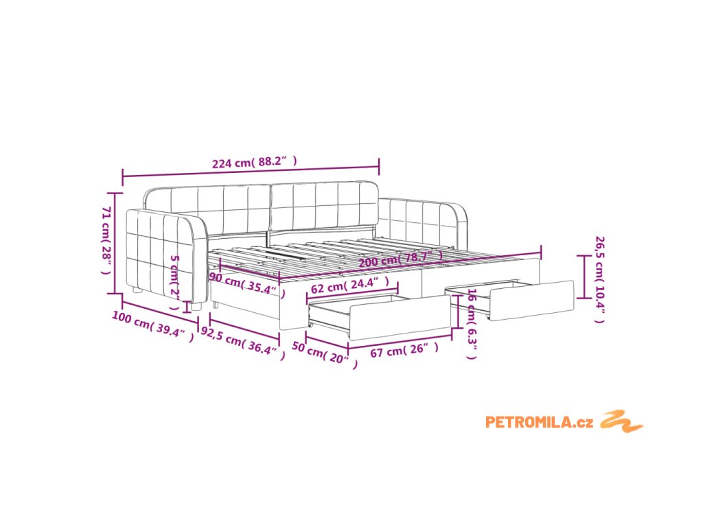 - Rozměry (nevysunuté): 224 x 100 x 71 cm (D x Š x V)