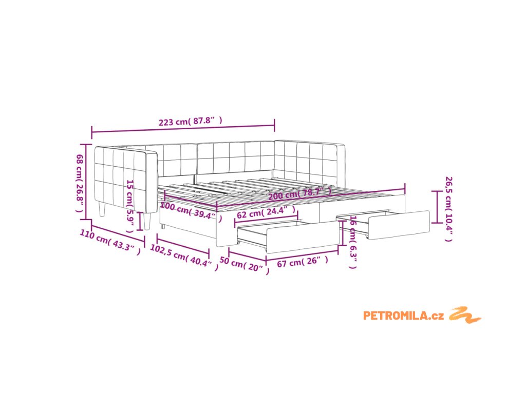 - Rozměry (nevysunuté): 223 x 110 x 68 cm (D x Š x V)