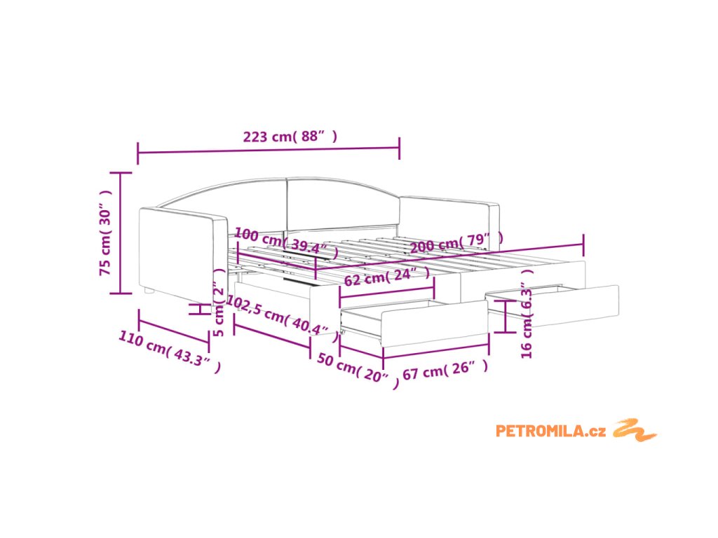 - Rozměry (nevysunuté): 223 x 110 x 75 cm (Š x H x V)