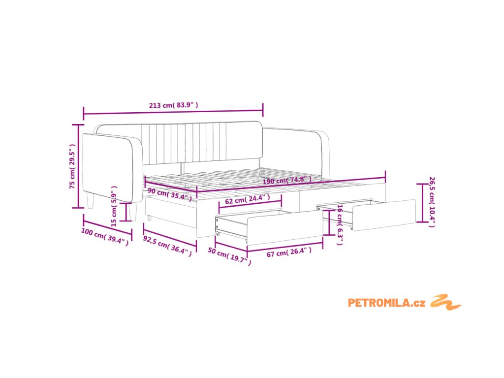 - Rozměry (nevysunuté): 213 x 100 x 75 cm (D x Š x V)