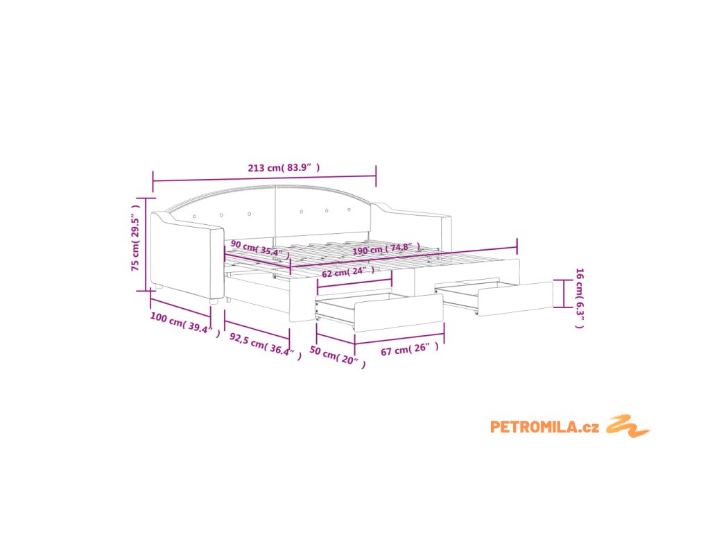 - Rozměry (nevysunuté): 213 x 100 x 75 cm (D x Š x V)