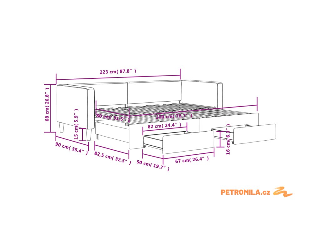 - Rozměry (nevysunuté): 223 x 90 x 68 cm (D x Š x V)