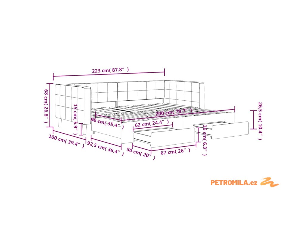 - Rozměry (nevysunuté): 223 x 100 x 68 cm (D x Š x V)