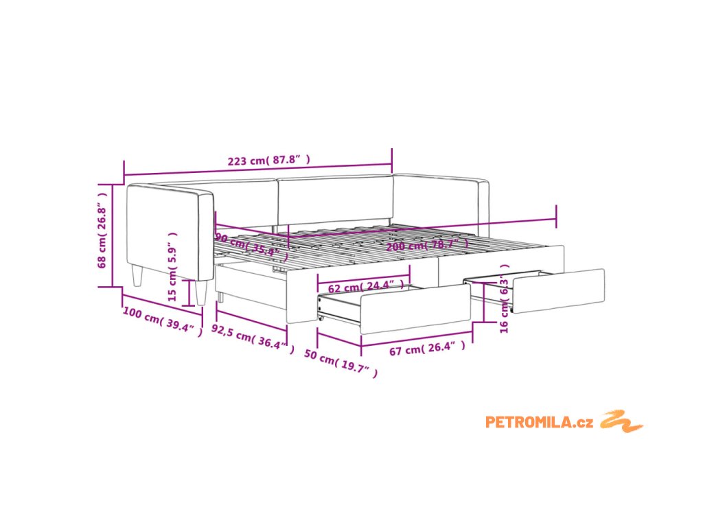 - Rozměry (nevysunuté): 223 x 100 x 68 cm (D x Š x V)