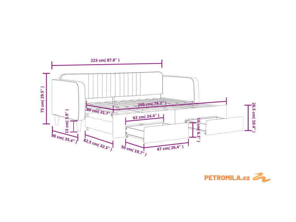 - Rozměry (nevysunuté): 223 x 90 x 75 cm (D x Š x V)