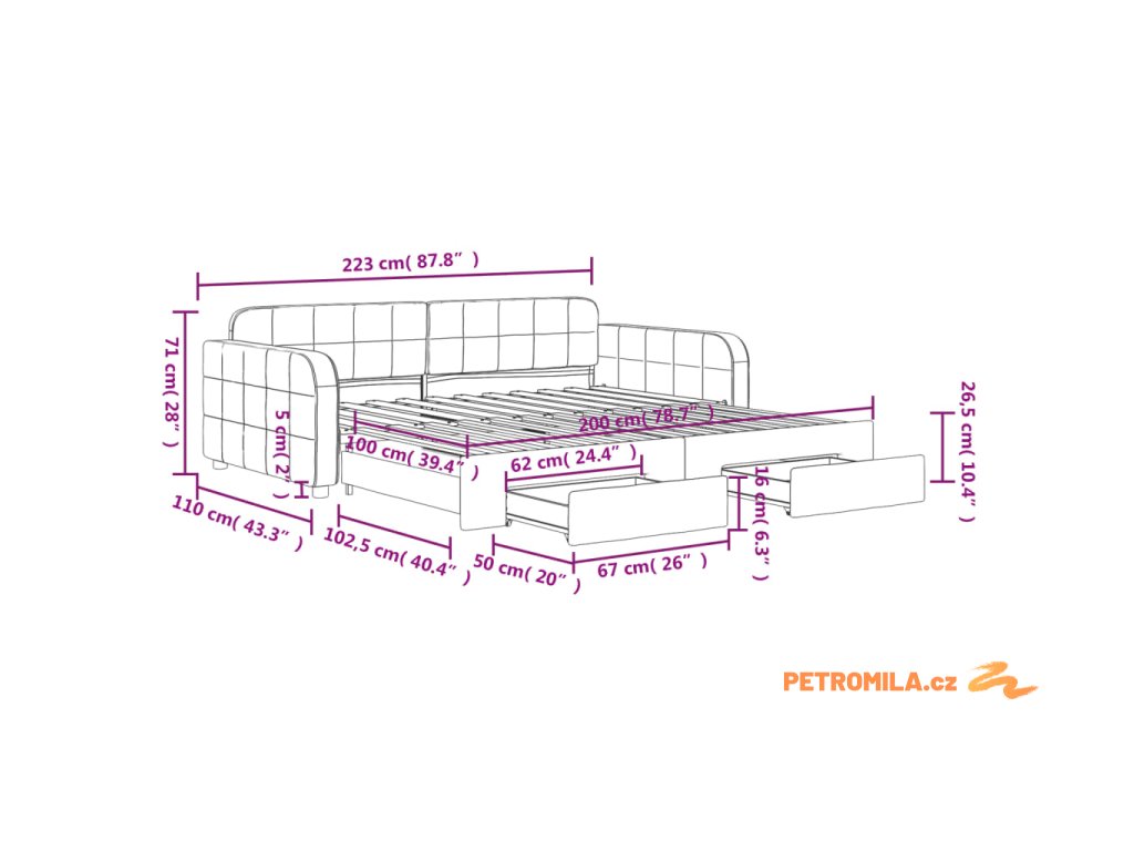 - Rozměry (nevysunuté): 223 x 110 x 71 cm (D x Š x V)