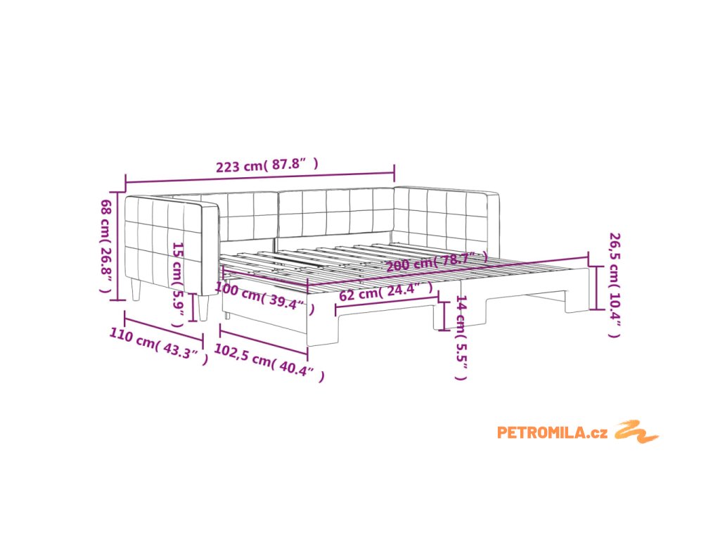 - Rozměry (nevysunuté): 223 x 110 x 68 cm (D x Š x V)