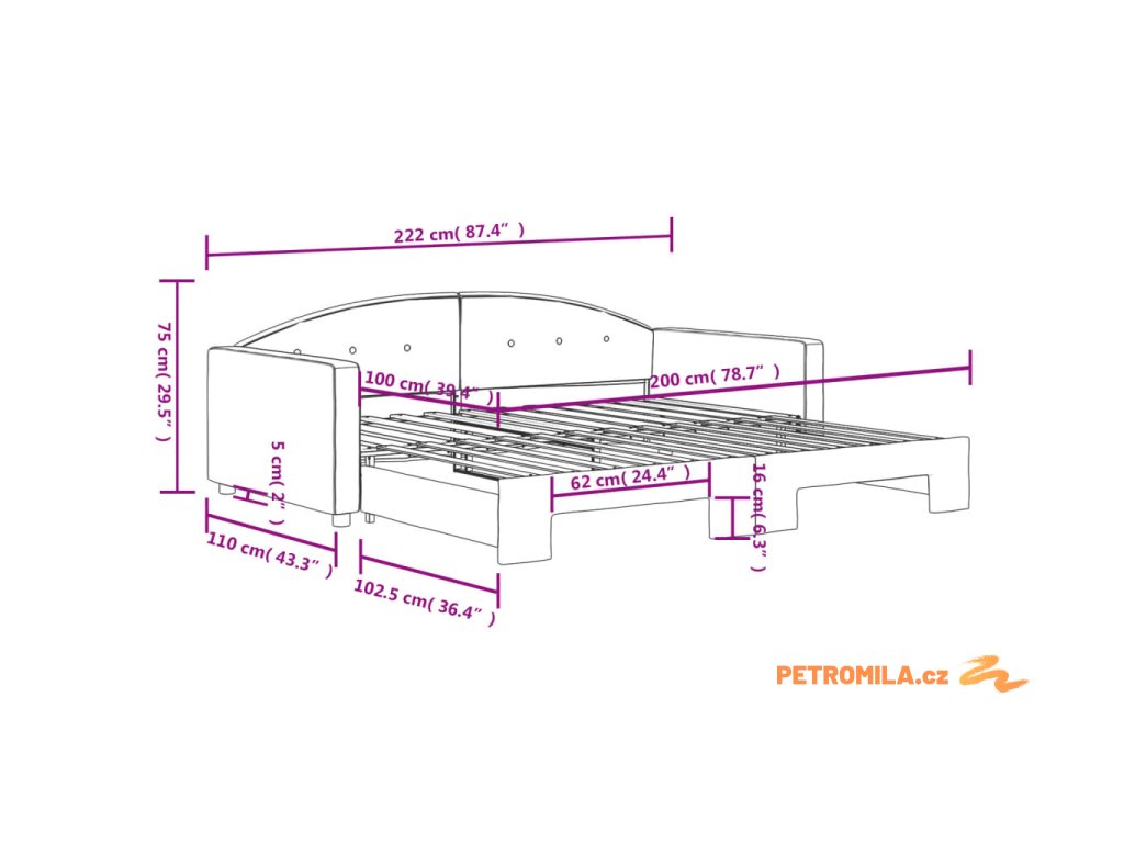 - Rozměry (nevysunuté): 222 x 110 x 75 cm (D x Š x V)