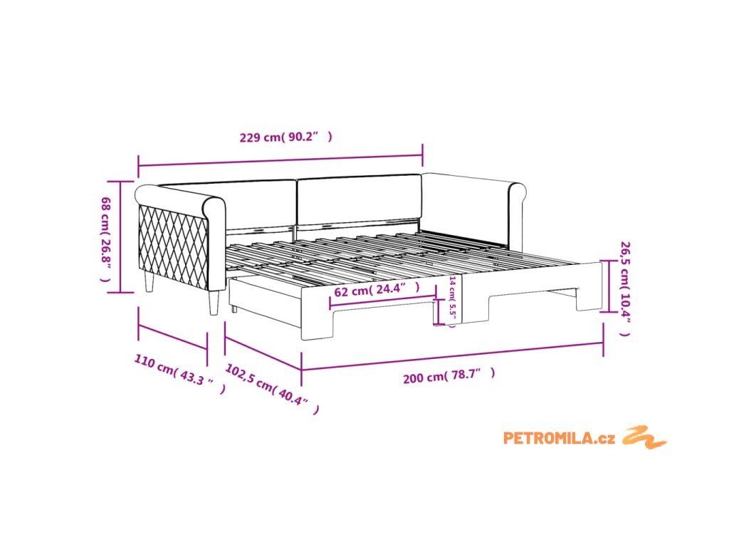 - Rozměry (nevysunuté): 229 x 110 x 68 cm (D x Š x V)