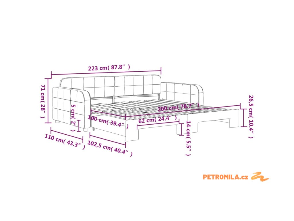 - Rozměry (nevysunuté): 223 x 110 x 71 cm (D x Š x V)
