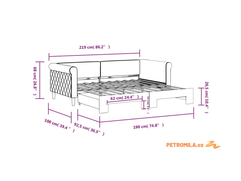 - Rozměry (nevysunuté): 219 x 100 x 68 cm (D x Š x V)