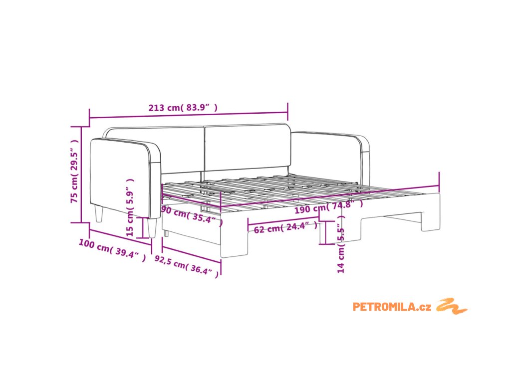 - Rozměry (nevysunuté): 213 x 100 x 75 cm (D x Š x V)