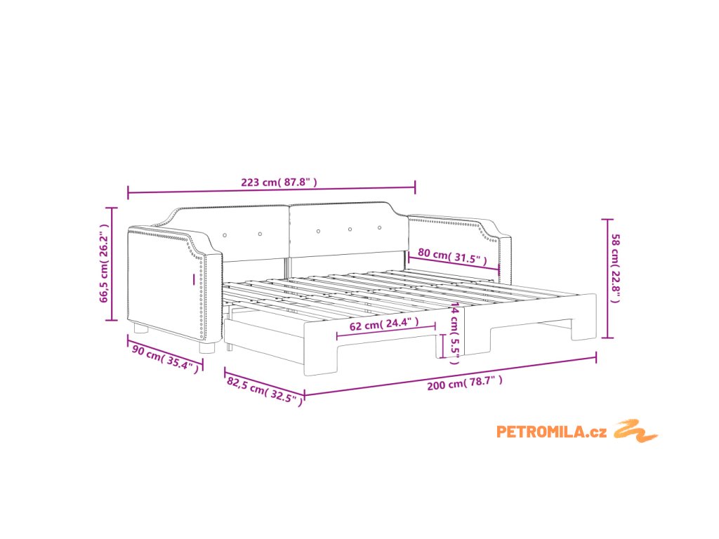 - Rozměry (nevysunuté): 223 x 90 x 66,5 cm (D x Š x V)