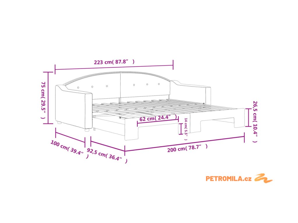 - Rozměry (nevysunuté): 223 x 100 x 75 cm (D x Š x V)