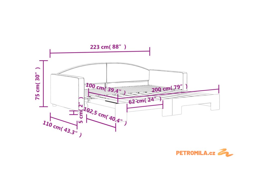 - Rozměry (nevysunuté): 223 x 110 x 75 cm (Š x H x V)