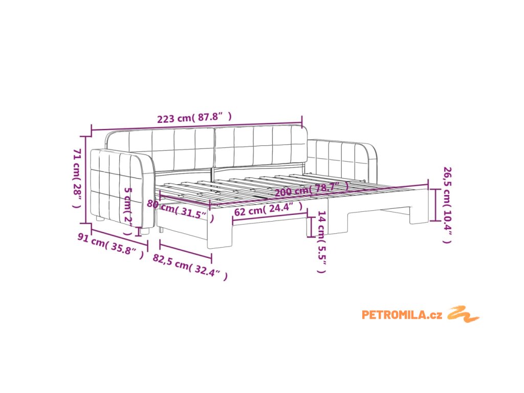 - Rozměry (nevysunuté): 223 x 91 x 71 cm (D x Š x V)