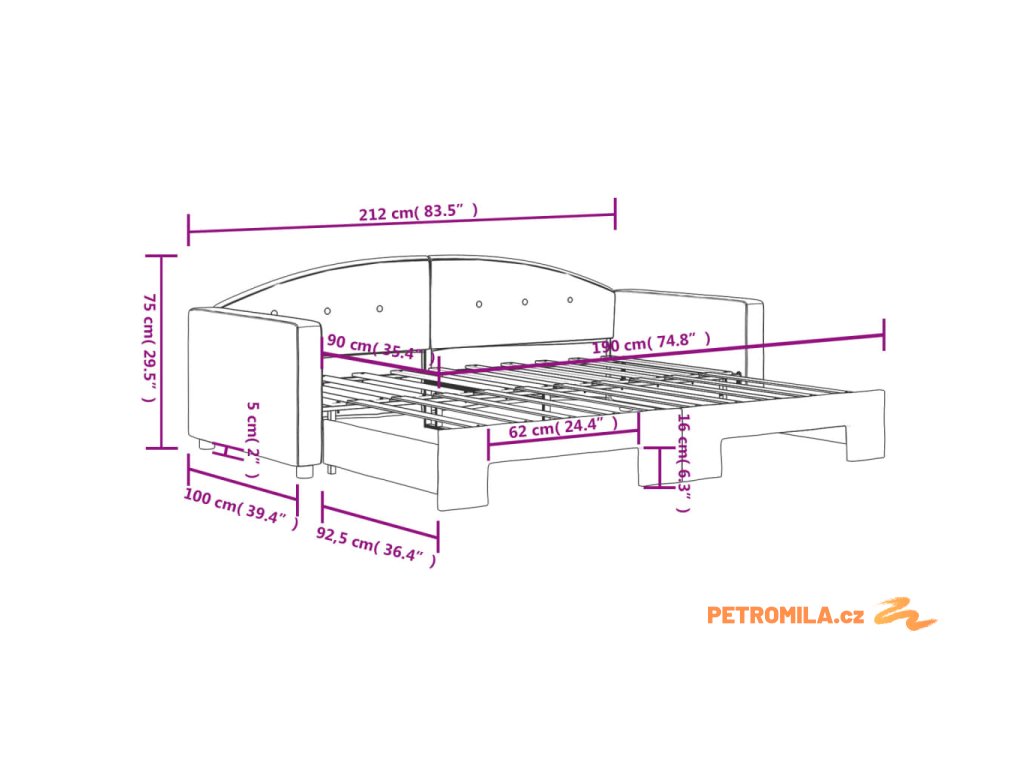 - Rozměry (nevysunuté): 212 x 100 x 75 cm (D x Š x V)