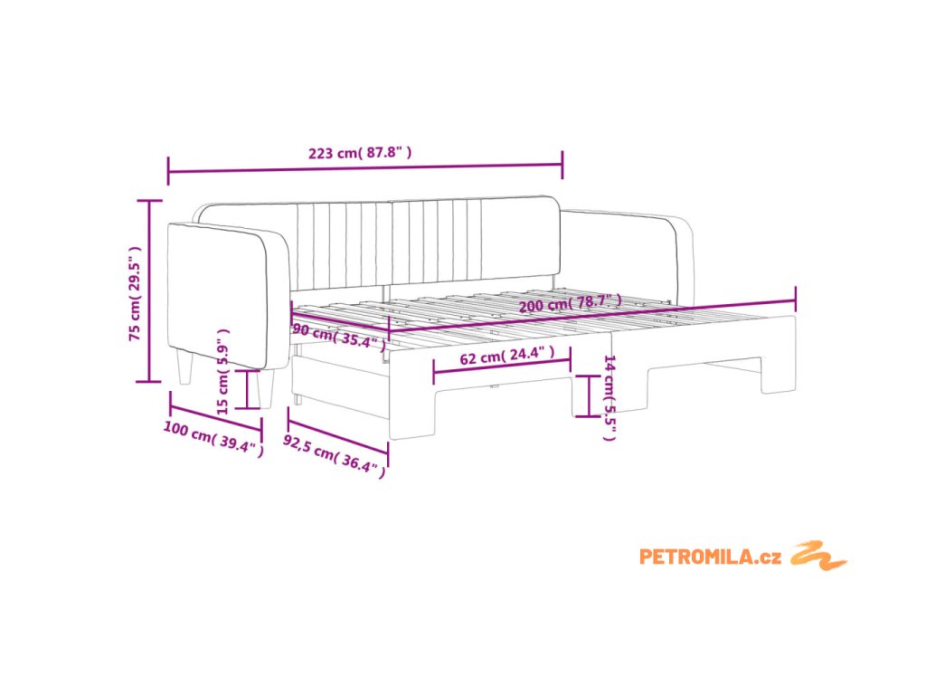 - Rozměry (nevysunuté): 223 x 100 x 75 cm (D x Š x V)