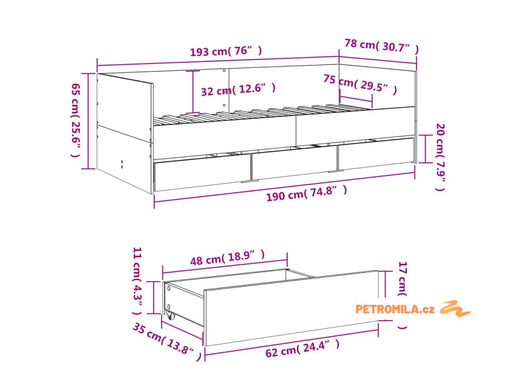 - Rozměry zásuvky postele (každá): 62 x 35 x 17 cm (D x Š x V)