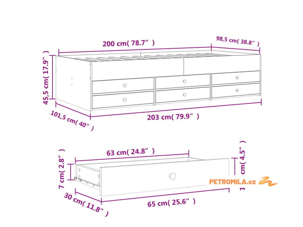 - Rozměry zásuvky postele (každá): 65 x 30 x 11,5 cm (D x Š x V)