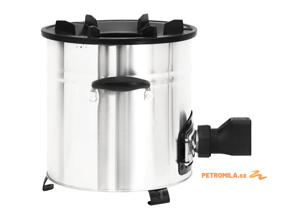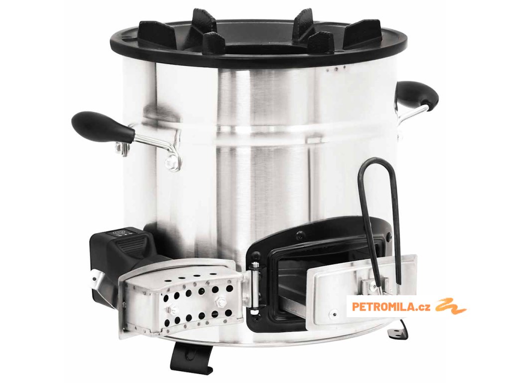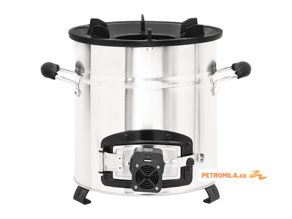 - Provedení s dvířky: Kempingový vařič je navržen i s dvířky ve spodní části, která slouží k připojení ventilátoru. Pomocí popelníku můžete z otvoru navíc vyjmout vychladlý popel.