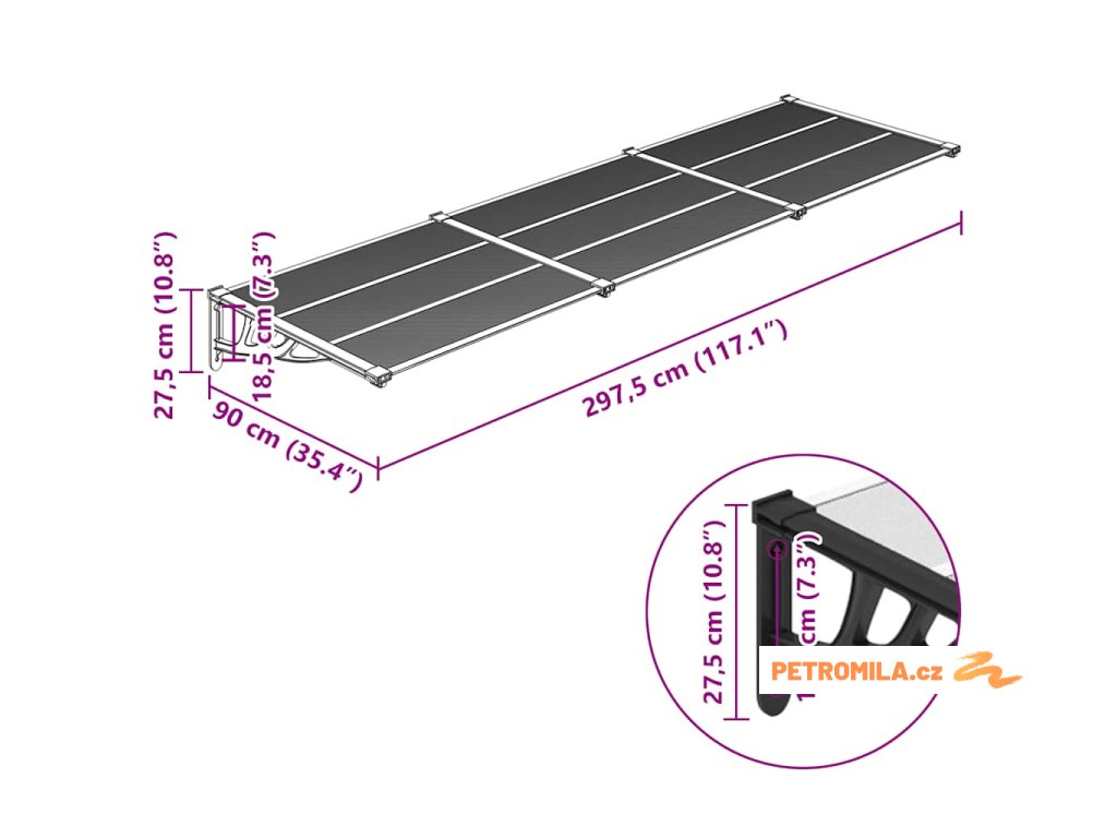 Vchodová stříška černá a průhledná 297,5 x 90 cm polykarbonát