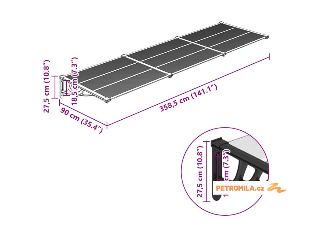 Vchodová stříška černá a průhledná 358,5 x 90 cm polykarbonát