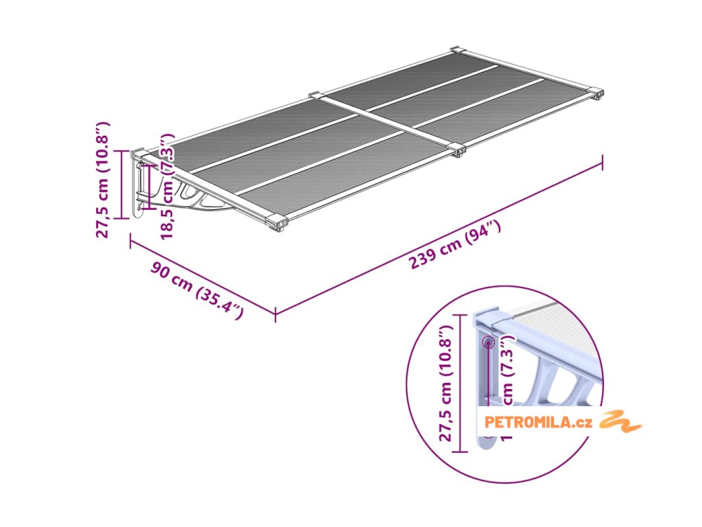Vchodová stříška šedá a průhledná 239 x 90 cm polykarbonát