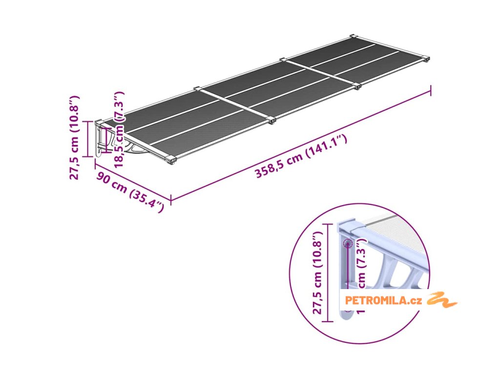 Vchodová stříška šedá a průhledná 358,5 x 90 cm polykarbonát