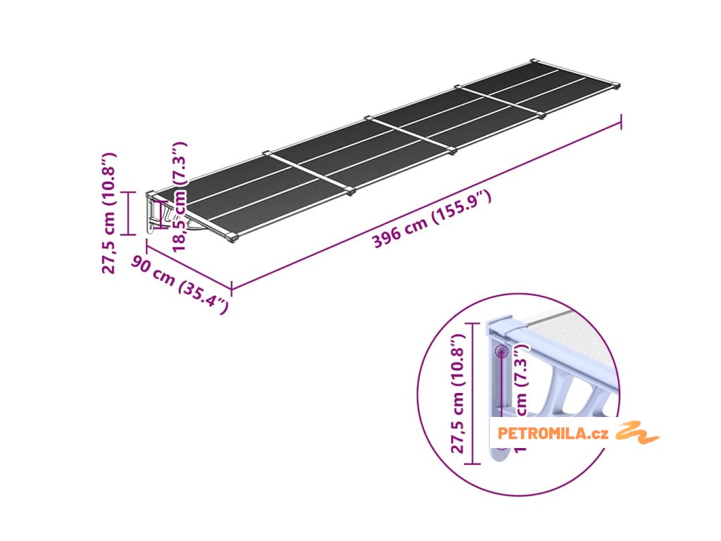 Vchodová stříška šedá a průhledná 396 x 90 cm polykarbonát