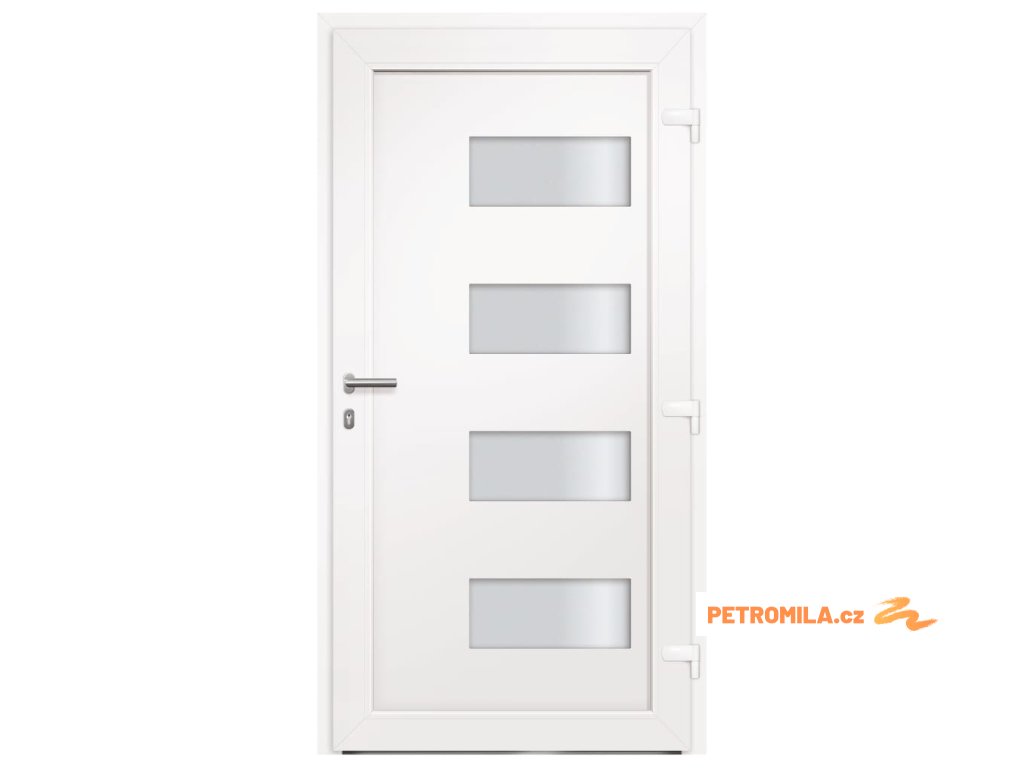 Vchodové dveře mají robustní rám i výplň, hliníkový práh, nastavitelné panty, bezpečnostní zámek s jazýčkem a háčkem a 5 stavítky, izolační zasklení a výztuhou z pozinkované oceli. Samotné dveře jsou vyrobené z hliníku a PVC a vyznačují se svou působivou bytelností a vysoce praktickým zamykáním. Obdržíte je spolu s kompletní sadou, která obsahuje nerezovou úchytku, vnitřní kliku, klíče, těsnící pásku a montážní příslušenství.