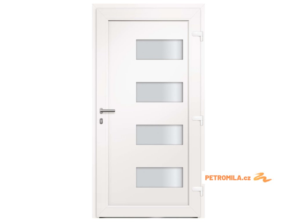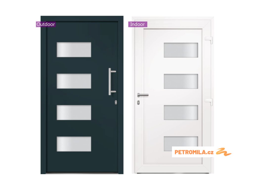 Vchodové dveře mají robustní rám i výplň, hliníkový práh, nastavitelné panty, bezpečnostní zámek s jazýčkem a háčkem a 5 stavítky, izolační zasklení a výztuhou z pozinkované oceli. Samotné dveře jsou vyrobené z hliníku a PVC a vyznačují se svou působivou bytelností a vysoce praktickým zamykáním. Obdržíte je spolu s kompletní sadou, která obsahuje nerezovou úchytku, vnitřní kliku, klíče, těsnící pásku a montážní příslušenství.