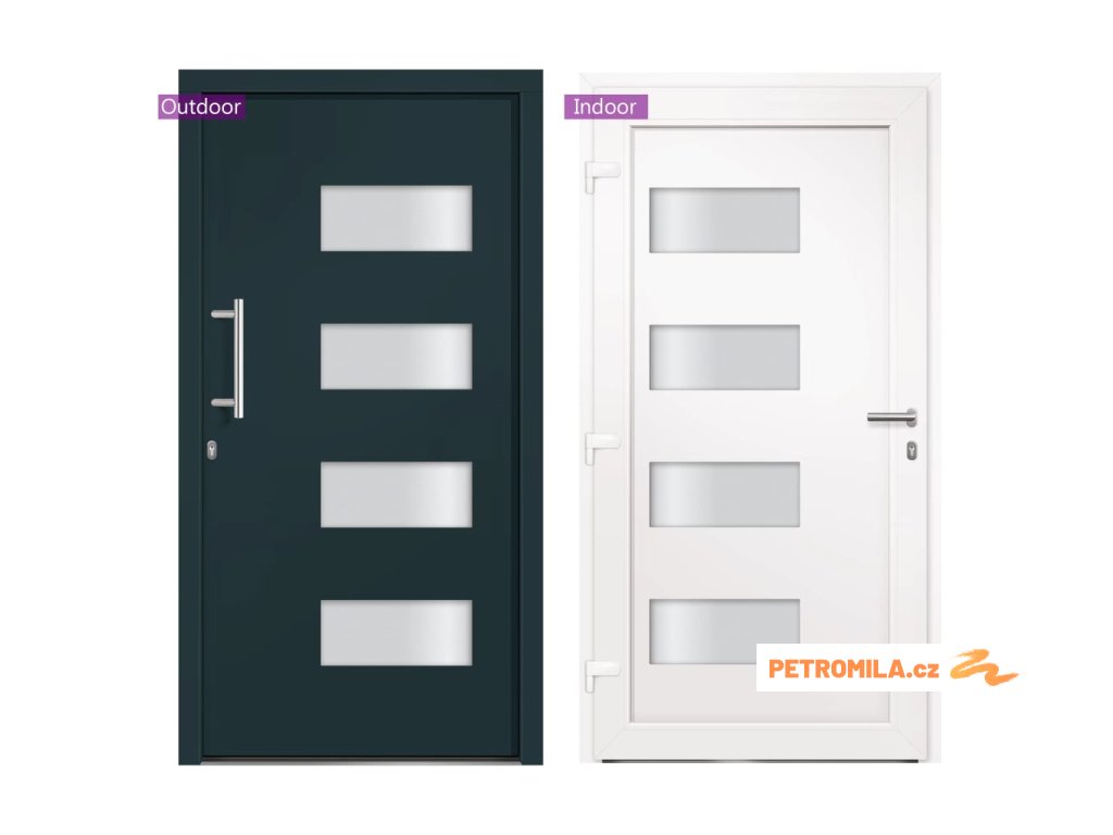 Vchodové dveře mají robustní rám i výplň, hliníkový práh, nastavitelné panty, bezpečnostní zámek s jazýčkem a háčkem a 5 stavítky, izolační zasklení a výztuhou z pozinkované oceli. Samotné dveře jsou vyrobené z hliníku a PVC a vyznačují se svou působivou bytelností a vysoce praktickým zamykáním. Obdržíte je spolu s kompletní sadou, která obsahuje nerezovou úchytku, vnitřní kliku, klíče, těsnící pásku a montážní příslušenství.