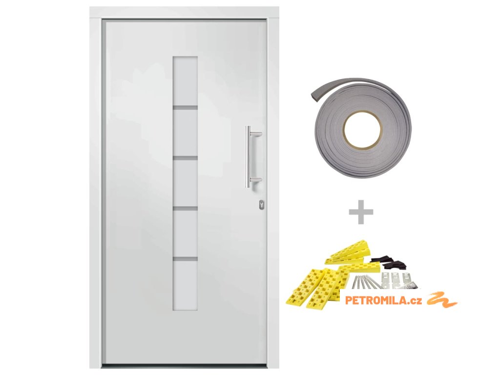 Vchodové dveře mají robustní rám i výplň, hliníkový práh, nastavitelné panty, bezpečnostní zámek s jazýčkem a háčkem a 5 stavítky, izolační zasklení a výztuhou z pozinkované oceli. Samotné dveře jsou vyrobené z hliníku a PVC a vyznačují se svou působivou bytelností a vysoce praktickým zamykáním. Obdržíte je spolu s kompletní sadou, která obsahuje nerezovou úchytku, vnitřní kliku, klíče, těsnící pásku a montážní příslušenství.