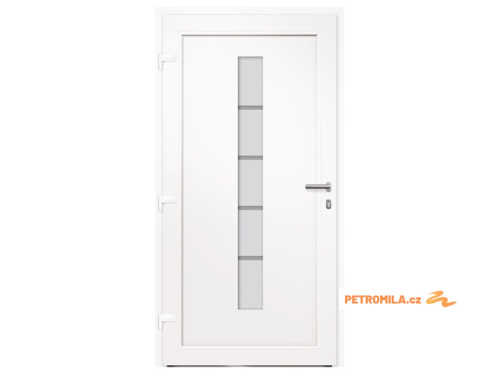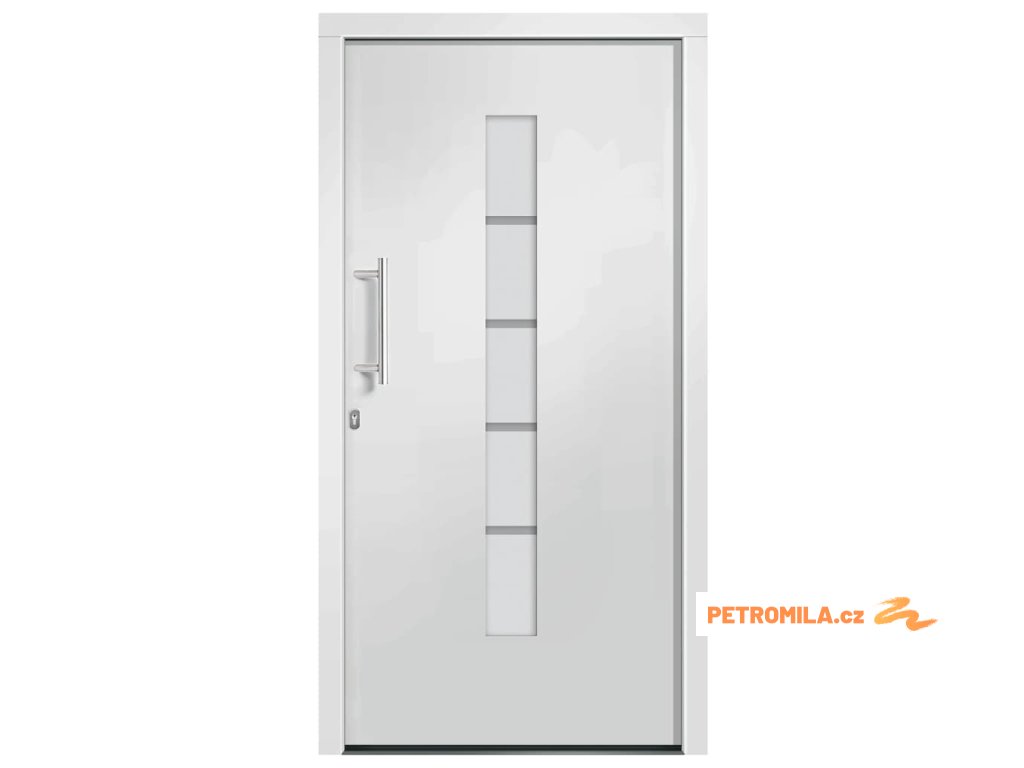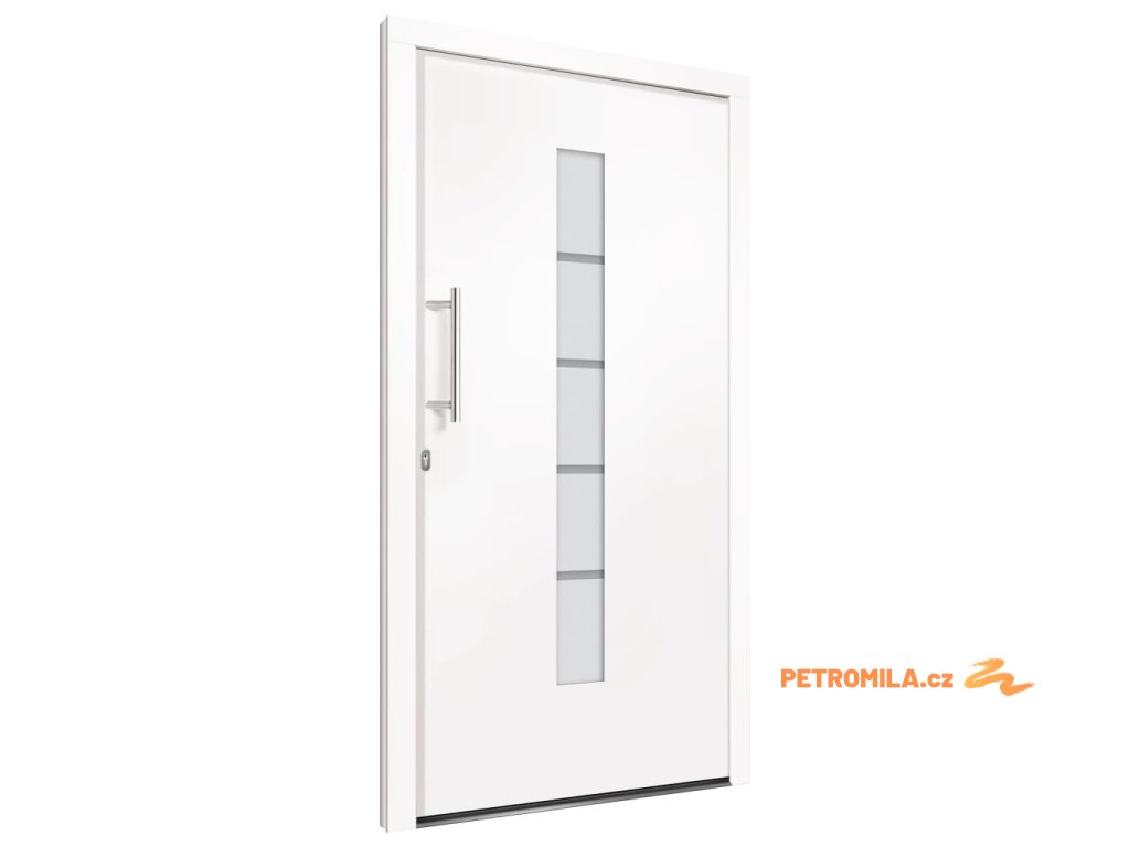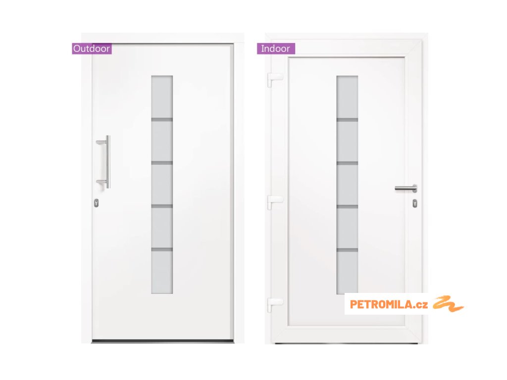Vchodové dveře mají robustní rám i výplň, hliníkový práh, nastavitelné panty, bezpečnostní zámek s jazýčkem a háčkem a 5 stavítky, izolační zasklení a výztuhou z pozinkované oceli. Samotné dveře jsou vyrobené z hliníku a PVC a vyznačují se svou působivou bytelností a vysoce praktickým zamykáním. Obdržíte je spolu s kompletní sadou, která obsahuje nerezovou úchytku, vnitřní kliku, klíče, těsnící pásku a montážní příslušenství.