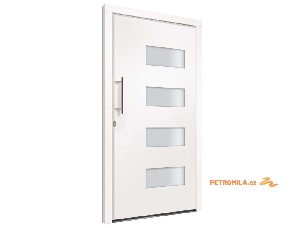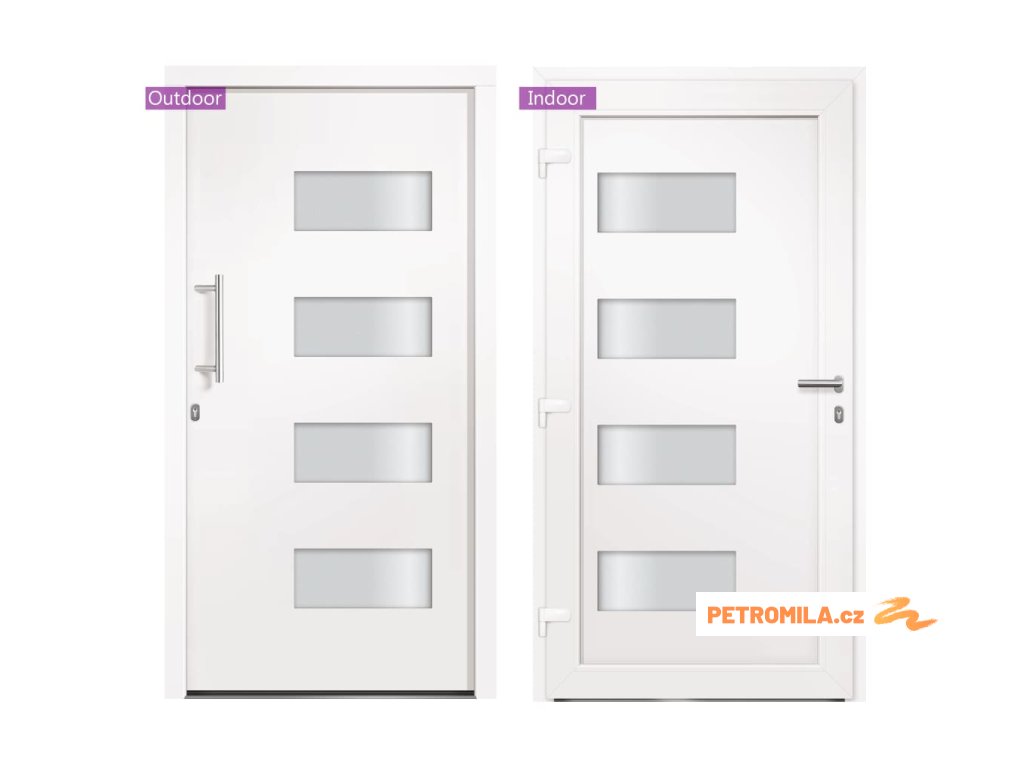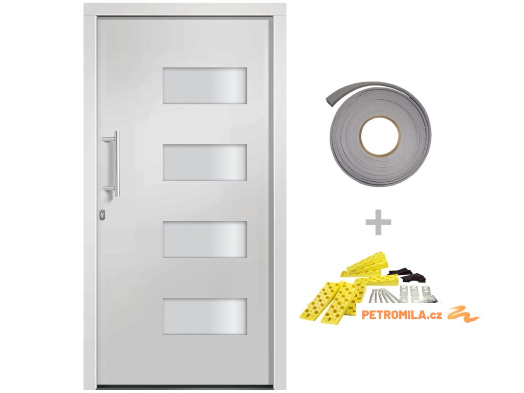 Vchodové dveře mají robustní rám i výplň, hliníkový práh, nastavitelné panty, bezpečnostní zámek s jazýčkem a háčkem a 5 stavítky, izolační zasklení a výztuhou z pozinkované oceli. Samotné dveře jsou vyrobené z hliníku a PVC a vyznačují se svou působivou bytelností a vysoce praktickým zamykáním. Obdržíte je spolu s kompletní sadou, která obsahuje nerezovou úchytku, vnitřní kliku, klíče, těsnící pásku a montážní příslušenství.