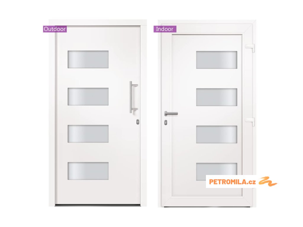 Vchodové dveře mají robustní rám i výplň, hliníkový práh, nastavitelné panty, bezpečnostní zámek s jazýčkem a háčkem a 5 stavítky, izolační zasklení a výztuhou z pozinkované oceli. Samotné dveře jsou vyrobené z hliníku a PVC a vyznačují se svou působivou bytelností a vysoce praktickým zamykáním. Obdržíte je spolu s kompletní sadou, která obsahuje nerezovou úchytku, vnitřní kliku, klíče, těsnící pásku a montážní příslušenství.